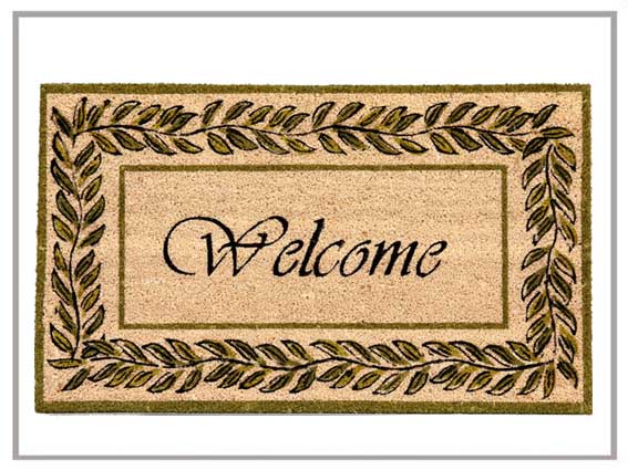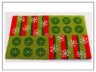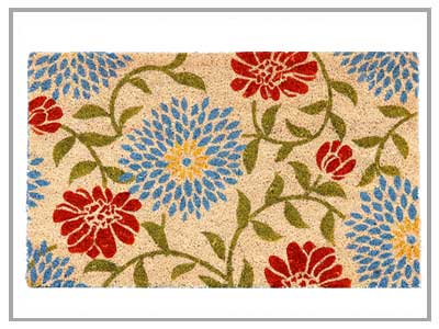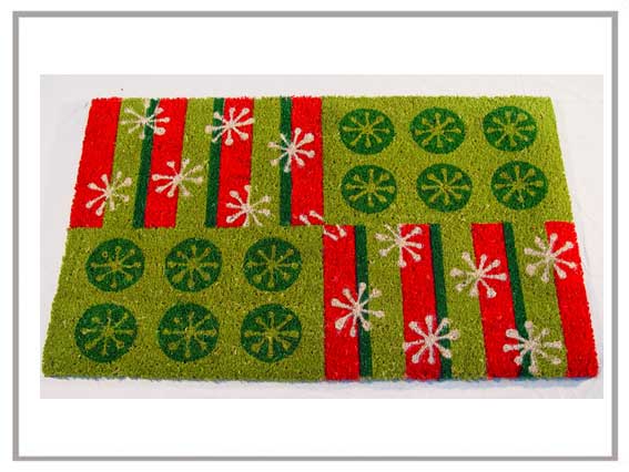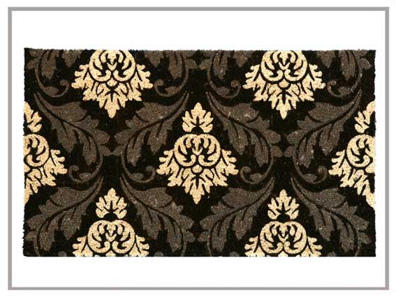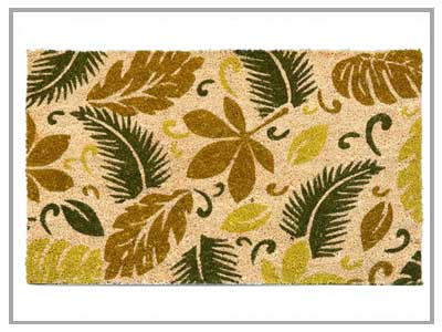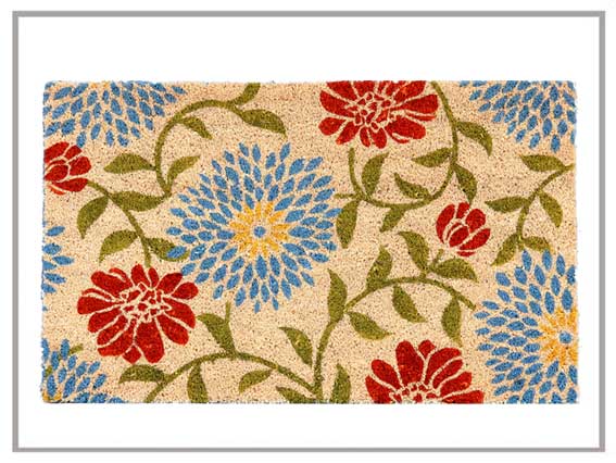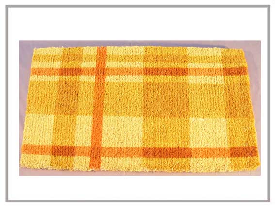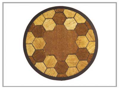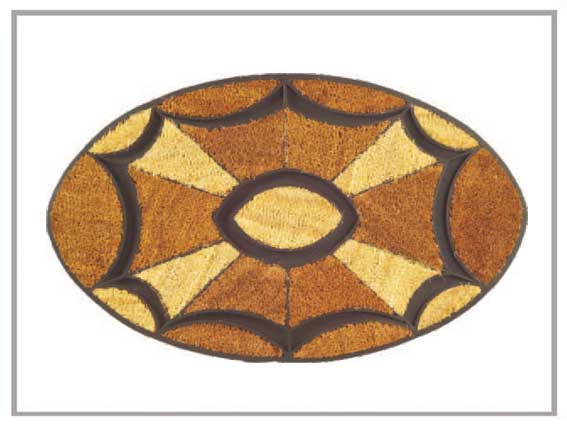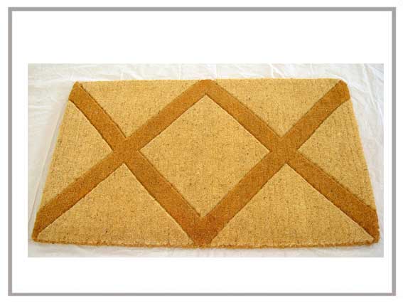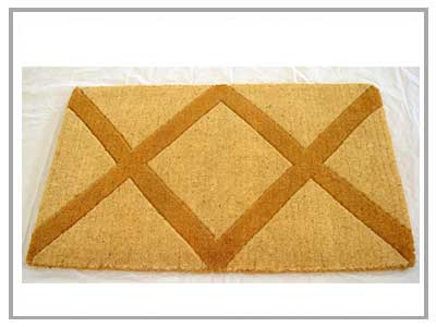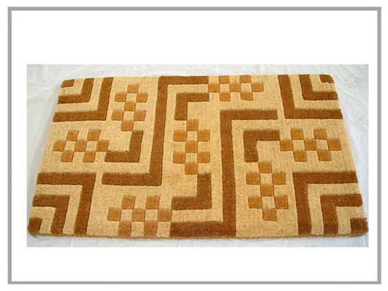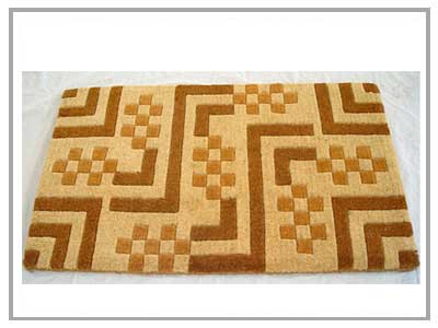 A traditionally hand tufted mat with a thick and compact brush, available in natural and bleach base. Designs are woven (Inlaid) into the mats. Outline can be beveled, clipped or grooved to make the designs stand out. Hand tufted mats of these types are available in a variety of printed designs. Azo-free light water-based coir pigments dyes are used to print the designs. Weight :- 7.800Kg / Sq. Mtr. Pile height :- 28MM