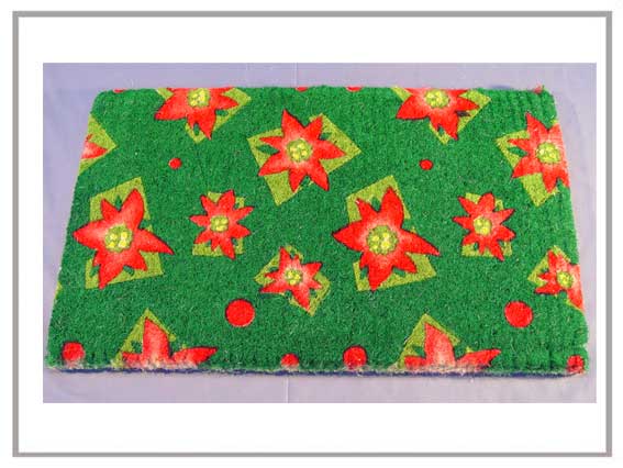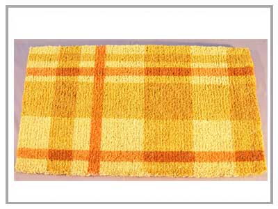 PVC tufted Vinyl-backed coir rolls and mats are made in a variety of sizes, thickness and appearance. Rolls having a maximum width of 2 meters do come in thickness ranging from 15mm to 23mm. The door mats are cut using computerised automatic cutting machines to ensure clean-cut-edges that are resistant to fraying and unravelling. These mats are flexible and non-slippery and vinyl backing ensures that the dirt is trapped in the mat itself & it is easy to clean. These are highly durable mats with attractively printed designs. Available in all sizes & shapes. Weight :- 5.500Kg / Sq. Mtr. Pile height :- 15MM